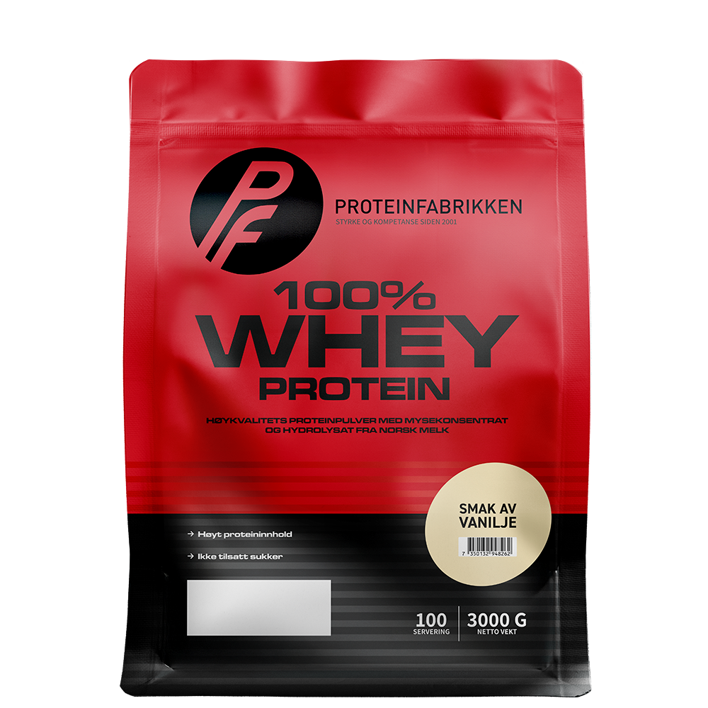 100% Whey Protein fra Proteinfabrikken inneholder høykvalitativ myse før et velsmakende og muskelbyggende proteinpulver som er lett å blande.