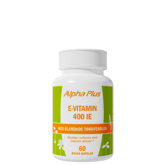 E-vitamin 400 IE 60 kap fra Alpha Plus gir deg 271 mg α-TE E-vitamin fra D-alfa-tokoferylacetat samt en naturlig blanding av gamma-, delta-, alfa- og beta-tokoferol.
