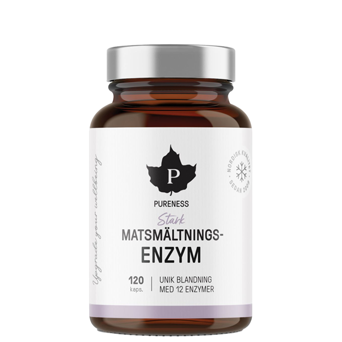 Sterkt fordøyelsesenzym 120 kapsler, er et kosttilskudd fra Pureness med 12 forskjellige fordøyelsesenzymer som tas før måltider.